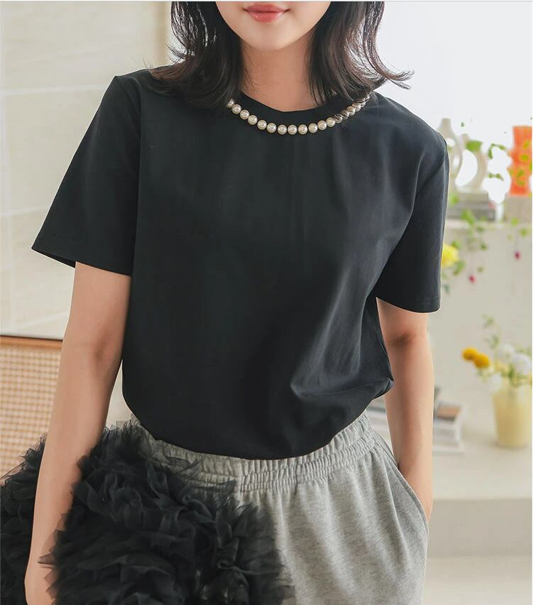 シャツ トップス 三分袖 パール付き ラウンドネック レディース 大人可愛い
